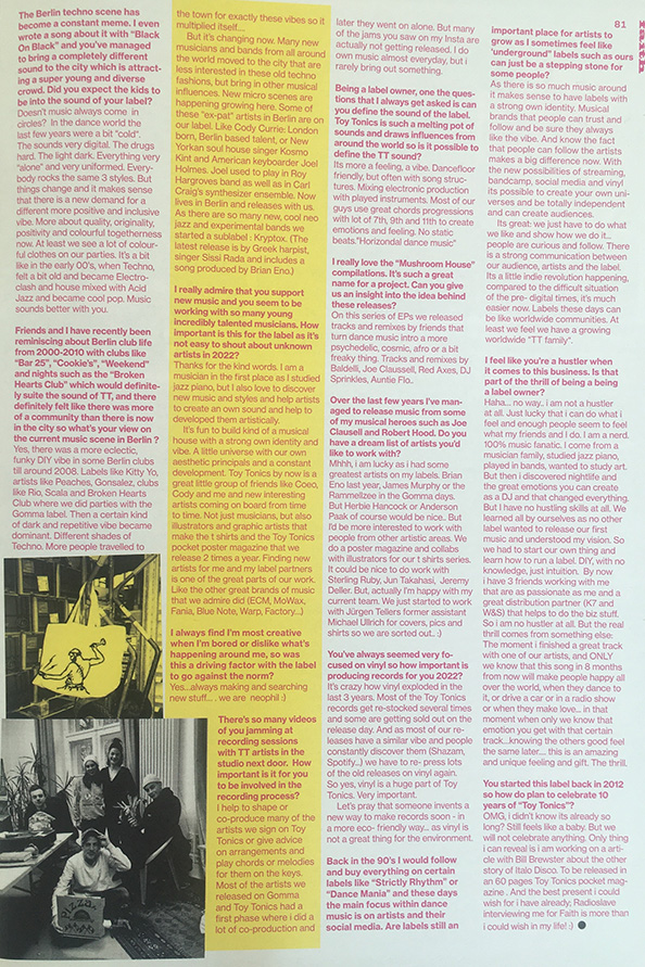 We release music, T-shirts, posters and a fanzine. And we organize the TOY TONICS JAMS where we spread our style and vibe.